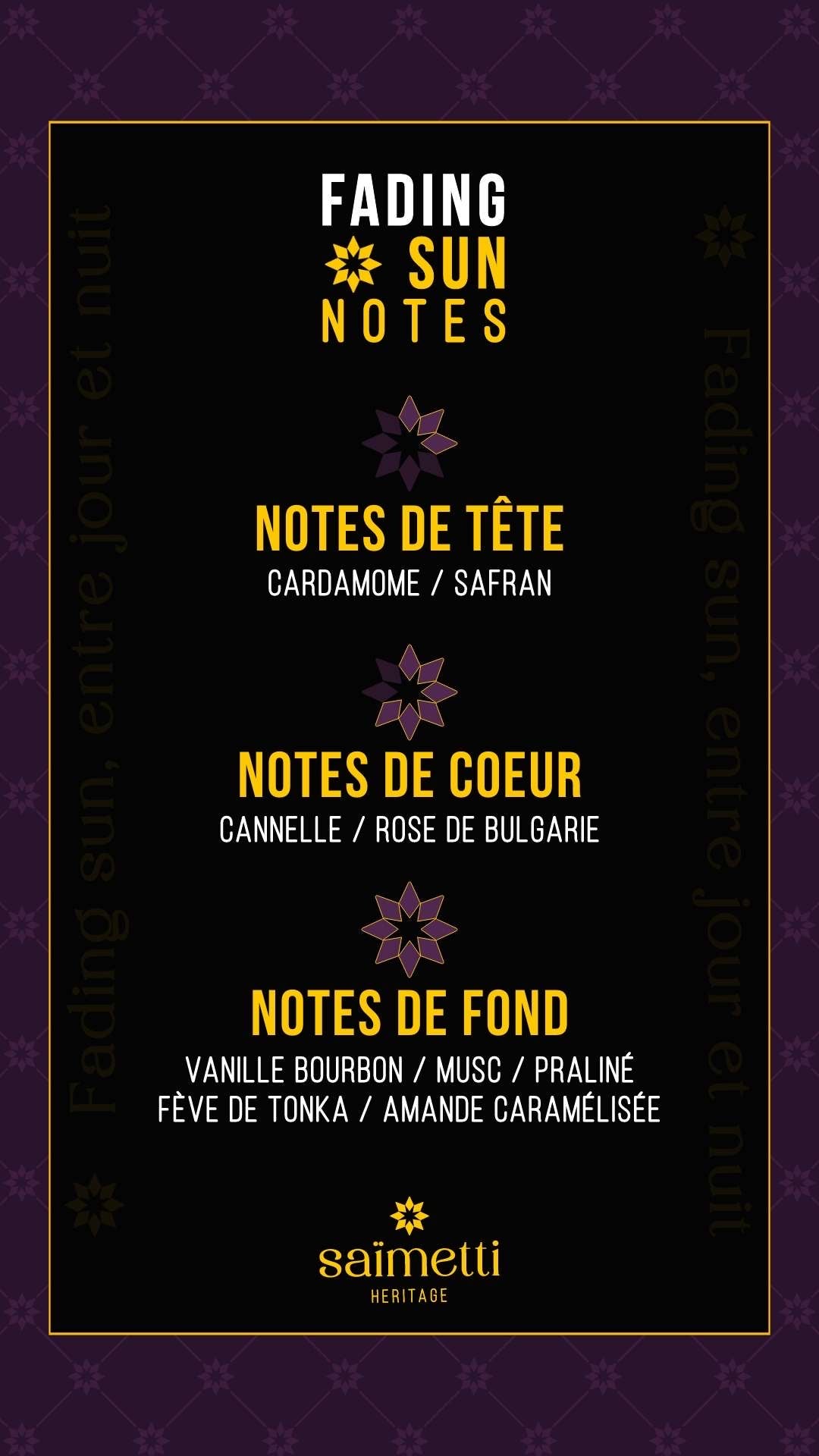 Ni pleinement lumineux, ni tout à fait obscur, ce parfum incarne la rencontre de la chaleur du jour et de la fraîcheur naissante de la nuit, équilibrant ce qui s’achève et ce qui commence.